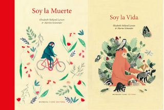 Soy la vida, generalmente recomendados a partir de 6 años, acompañan a l@s lector@s a descubrir los seres vivientes, describiendo las etapas que desde el nacimiento, a través del crecimiento, los llevan finalmente a la muerte, una etapa natural más de la que son conscientes desde el principio. Además de las ilustraciones maravillosas y la poesía en el texto, me ha asombrado la delicadeza y la firmeza con la que pasean entre miedos y dudas que rodean tanto la vida como la muerte, transmitiendo una insólita serenidad. Personalmente, recomiendo la lectura de ambos a la vez, no necesariamente en un momento crítico o relacionado con una pérdida. [El mensaje que tratan de transmitir es que hay una continuidad entre vida y muerte, que conviven y se suceden constantemente transformando los seres vivientes, todos, tal y como su naturaleza ha predispuesto. Creo que responden más bien a preguntas esporádicas sobre el ciclo de la vida, no tratan de enseñar un estado de ánimo en concreto, al contrario, proponen una visión general.]